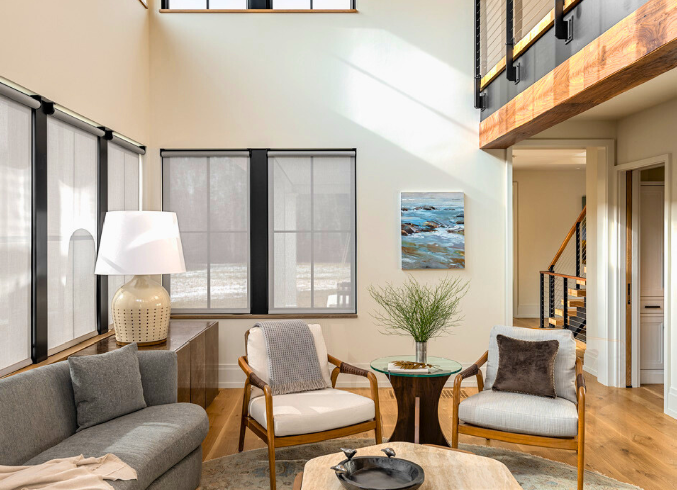 Interior painting with warm neutral tones to enhance natural light and define architectural details. Smooth, even finishes bring new life to this open living space.
